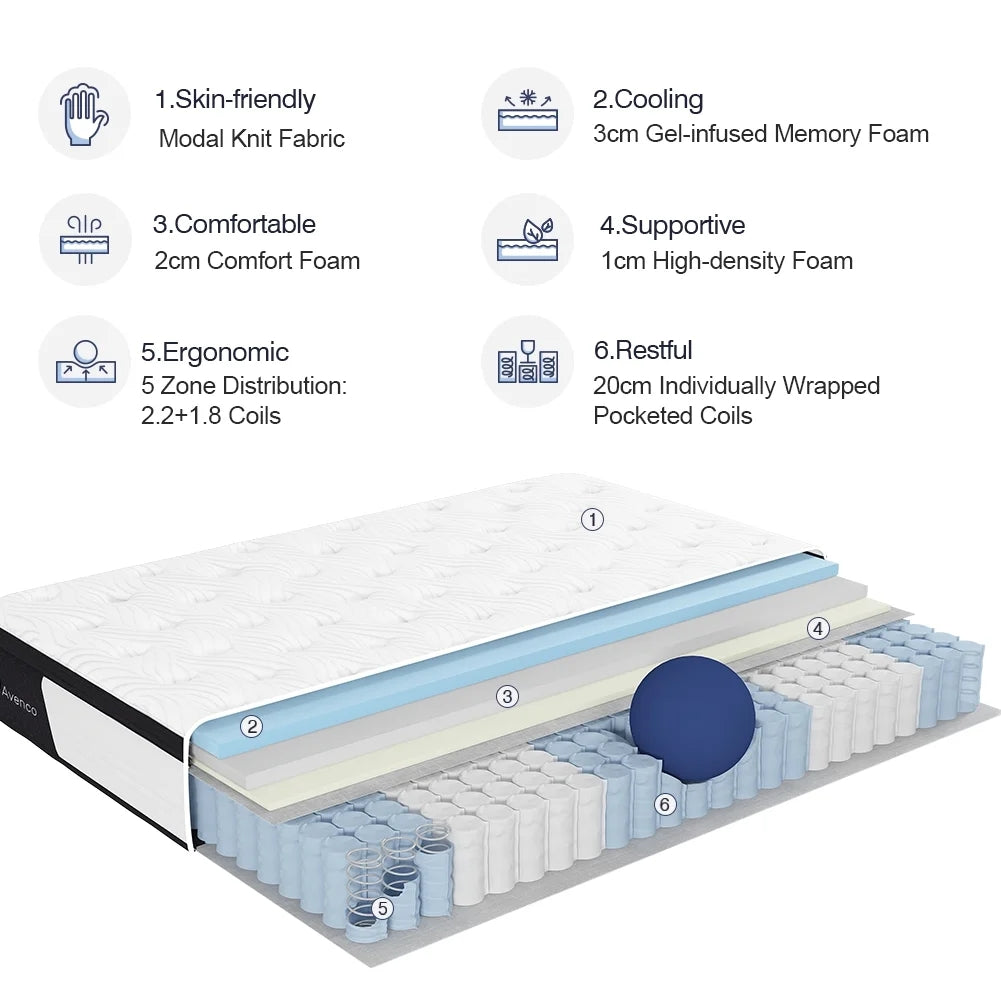 - HYBRID DESIGN FOR PERFECTLY COMFORT AND SUPPORT: The multi-layer foam and pocket spring system of Avenco mattress provide firm support but a pleasant feeling. Foam layers give you sleep comfort by slowly adapting to your body.