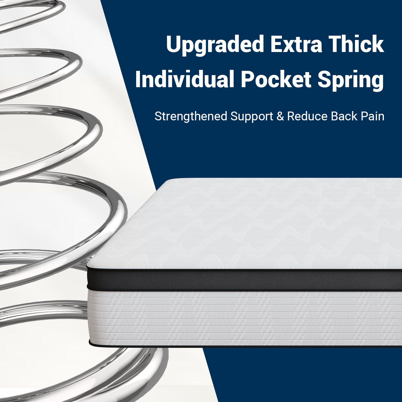 - Reinforced Edges: Crafted with 20% thicker steel springs along the edges, ensuring enhanced support when sitting at the queen mattress edge. No more slipping off, and it eliminates the discomfort of weak edge support when getting in and out of bed.